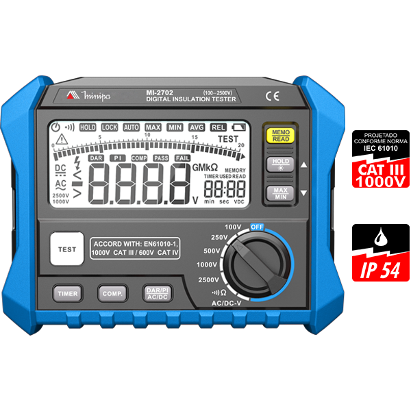 Megômetro Digital CAT III 1000V IP54 Minipa MI-2702 – Certificado de Calibração RBC/INMETRO