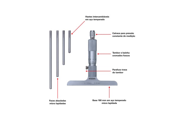 – Faces de Medição: Abauladas em aço temperado micro lapidado, hastes Ø4,5 mm