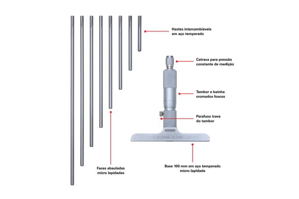 – Faces de Medição: Abauladas em aço temperado micro lapidado, hastes Ø4,5 mm