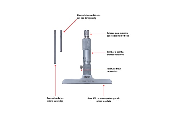 – Faces de Medição: Abauladas em aço temperado micro lapidado, hastes Ø4,5 mm