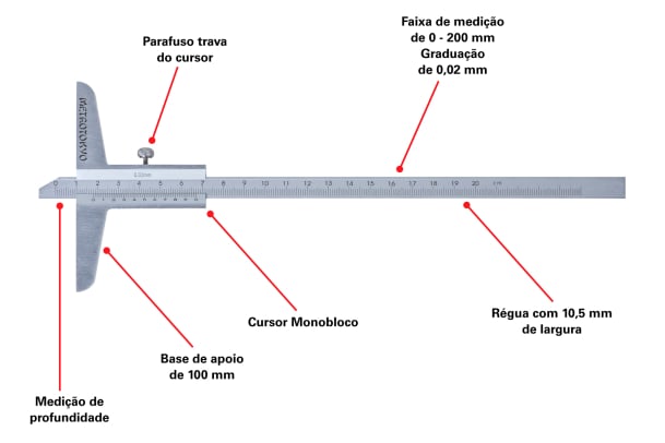 – Régua: Com guias ressaltadas (impede o desgaste da gravação) com acabamento cromado fosco