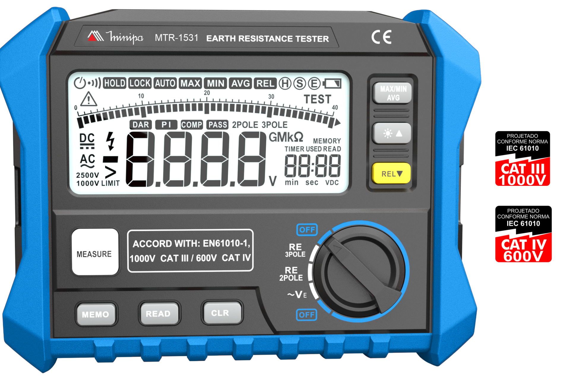 Terrômetro digital 3Ohm~4KOhm 3 2/3 dígitos CAT III 1000V CAT IV 600V Minipa MTR-1531